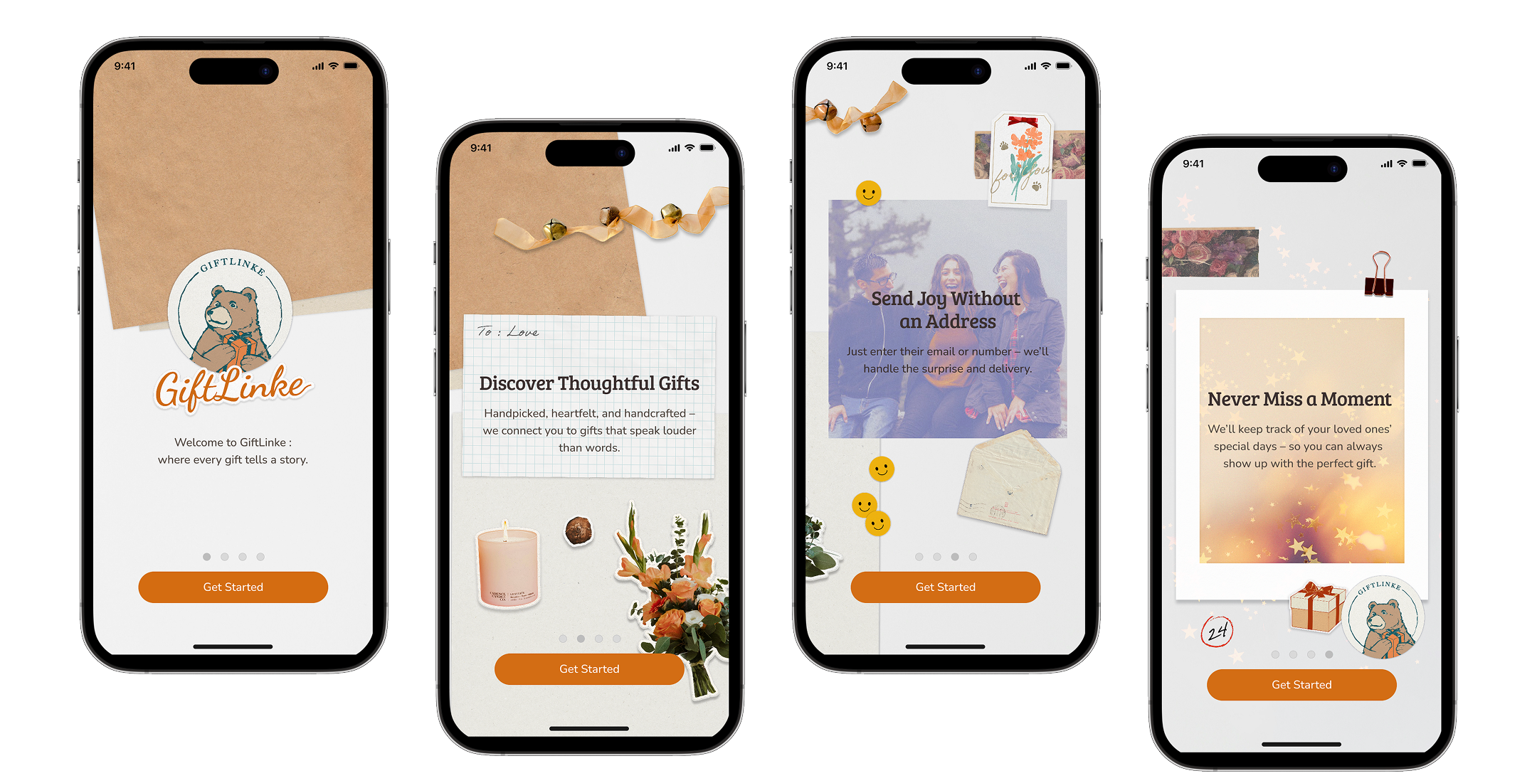 GiftLinke is a mobile-first gifting platform that helps people send thoughtful presents from small businesses. The client wanted journal-inspired, handcrafted visuals for their onboarding experience.