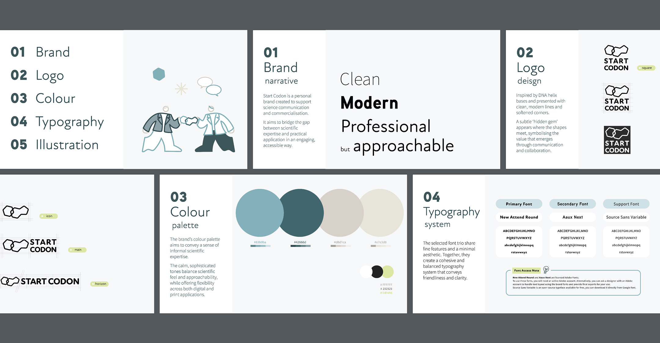 Start Codon is an Australian consultancy that supports scientific researchers by providing expert advice, helping to commercialise their studies, and translating their work into accessible formats. Their services focus on three key areas: consulting, commercialisation, and communication. The client approached for a full rebrand to better reflect their role as a bridge between the scientific community and the wider public.